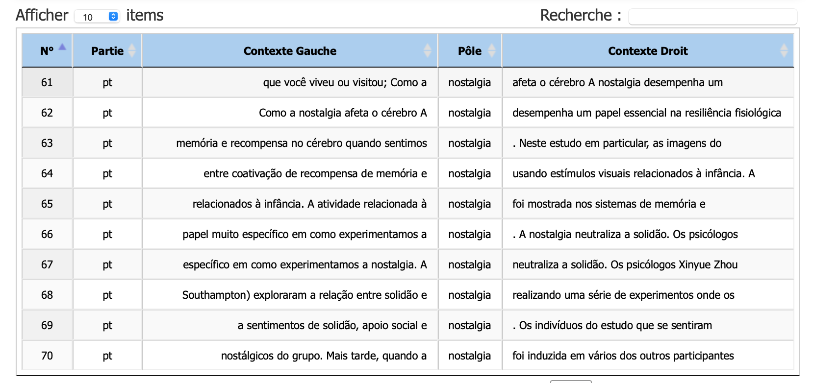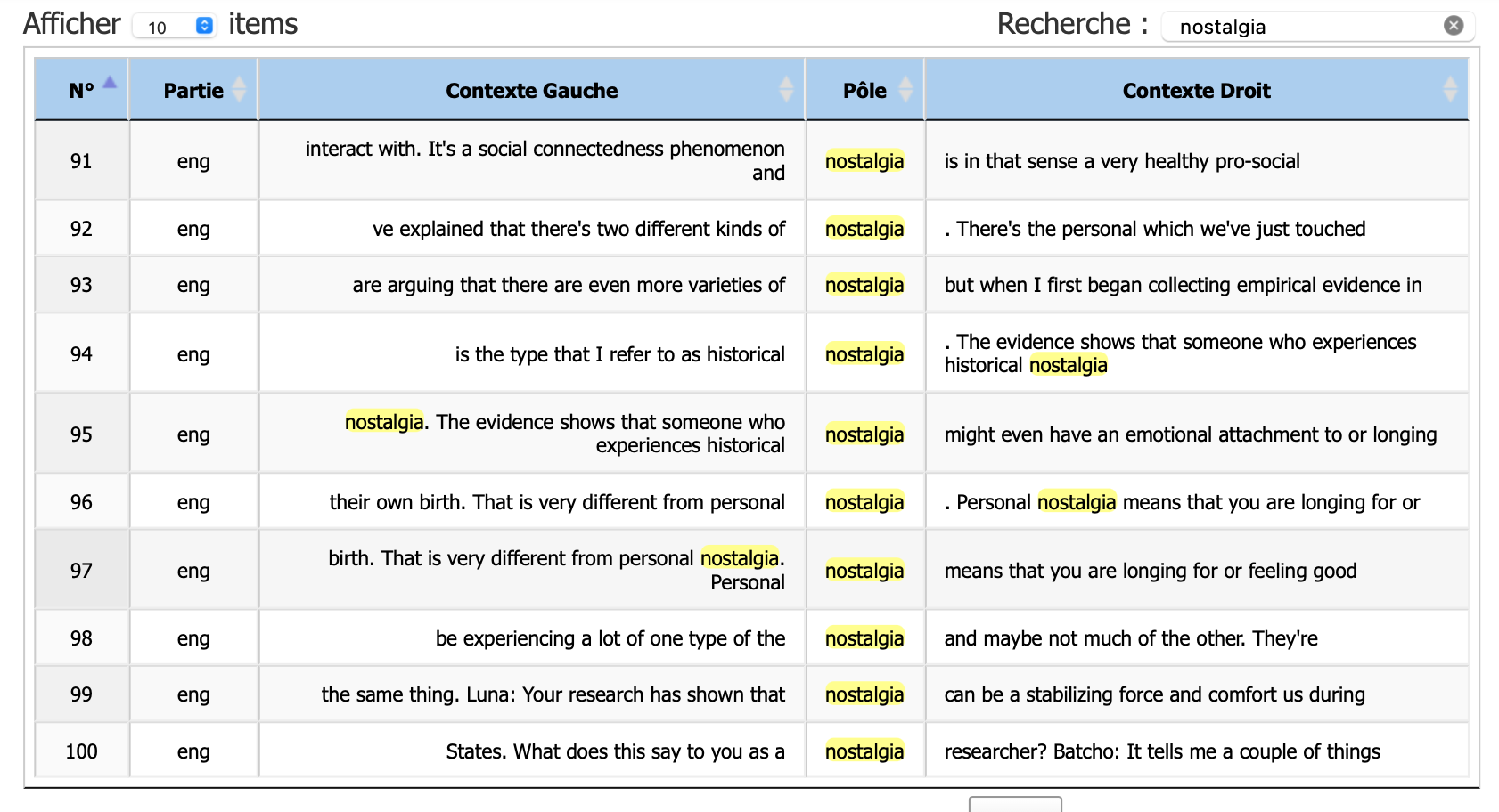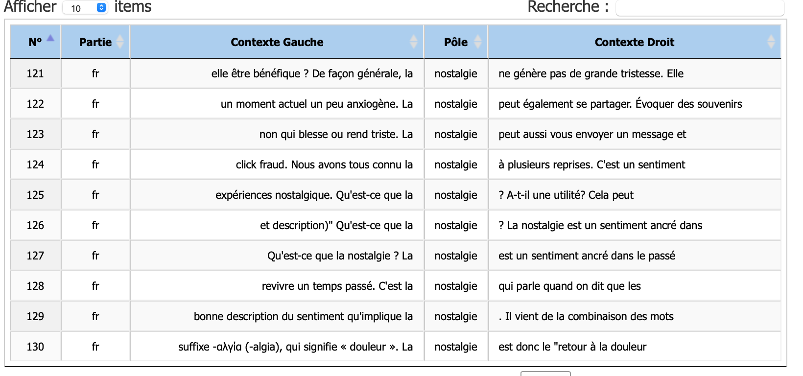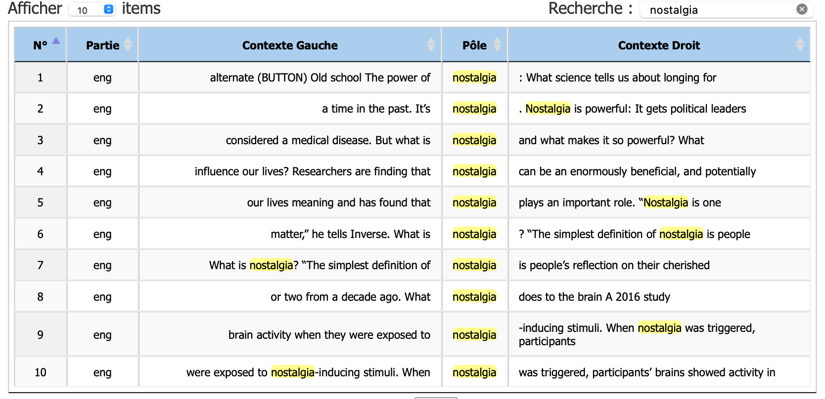 Nous avons choisi une cinquantaine de liens par langues contenant le mot nostalgie et ses possibles traductions. Grâce au programme de base pour la création des tableaux, nous avons pu aspirer le contenu textuel de la page et créer un contexte pour chaque apparition du mot nostalgie.