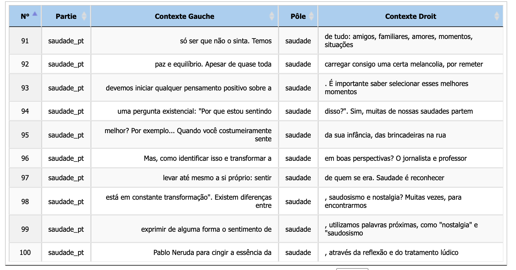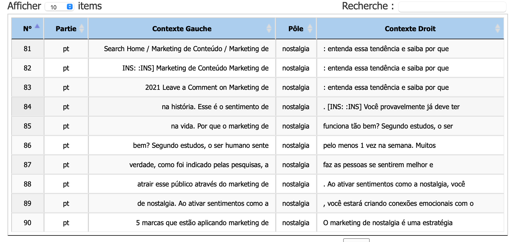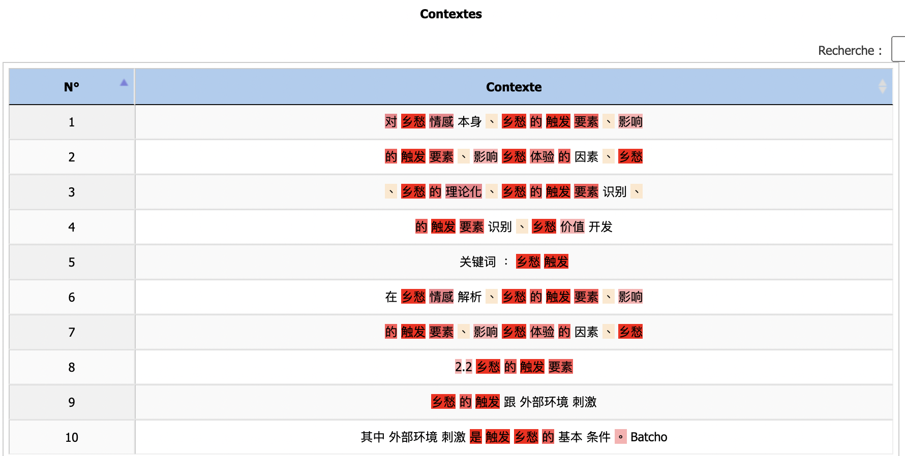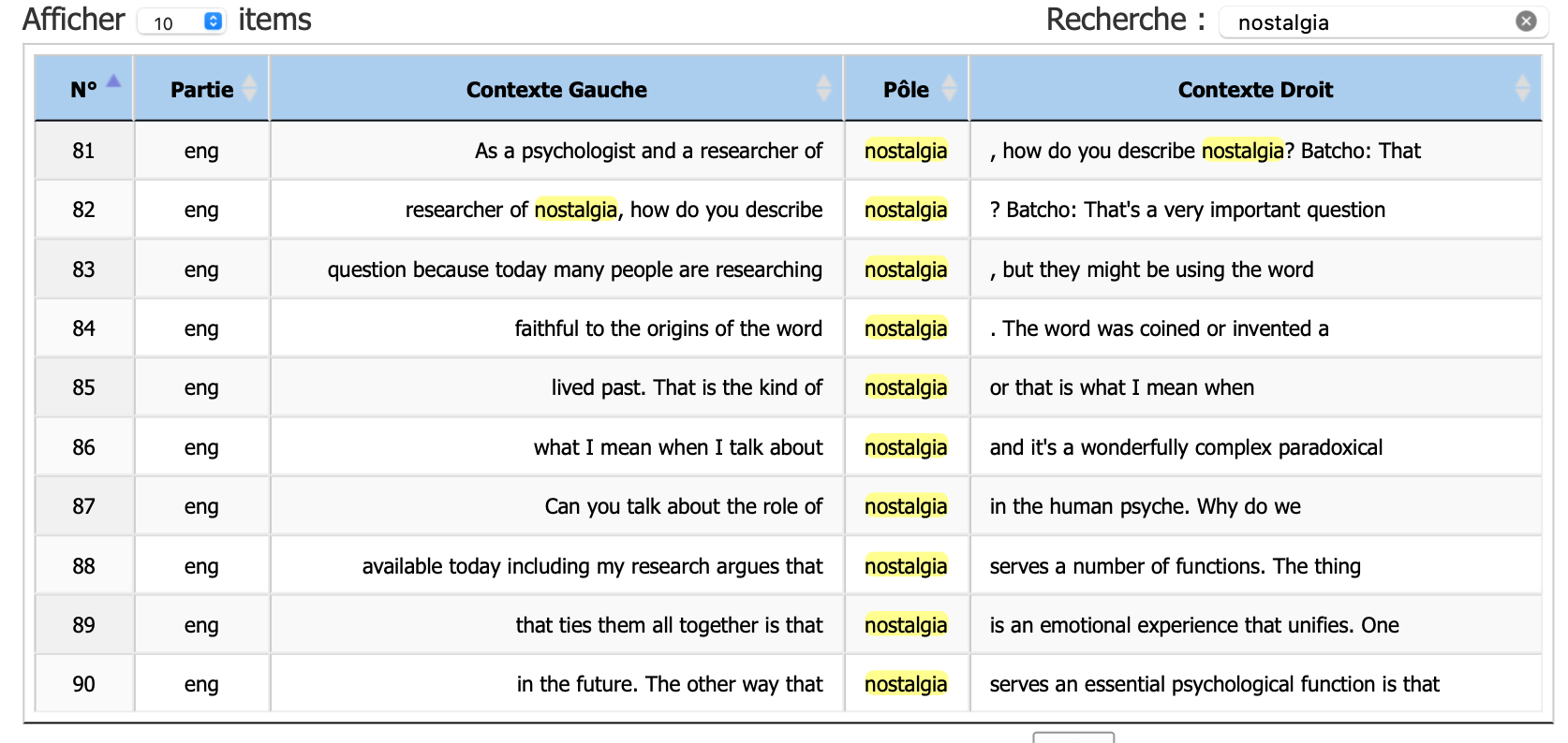 Nous avons choisi une cinquantaine de liens par langues contenant le mot nostalgie et ses possibles traductions. Grâce au programme de base pour la création des tableaux, nous avons pu aspirer le contenu textuel de la page et créer un contexte pour chaque apparition du mot nostalgie.