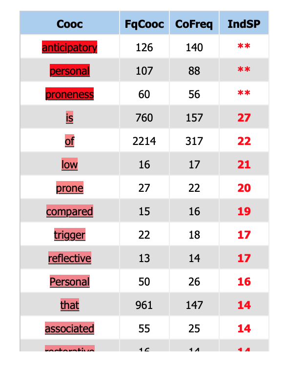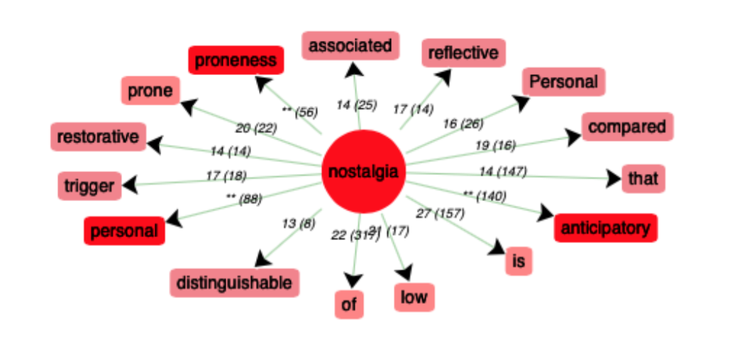 A travers les cooccurrents on peut voir que le mot "anticipatory" ainsi que "personal" et "proneness" (prédisposition) sont les mots d'apparition les plus fréquents avec le mot "nostalgia" en anglais.