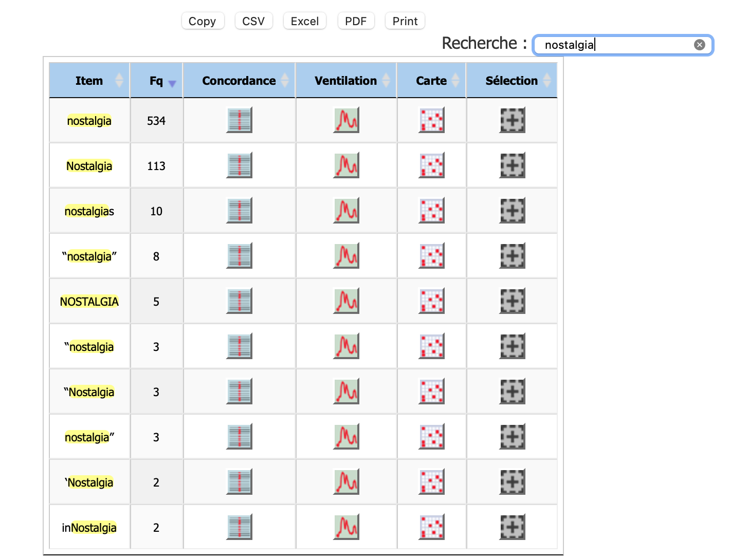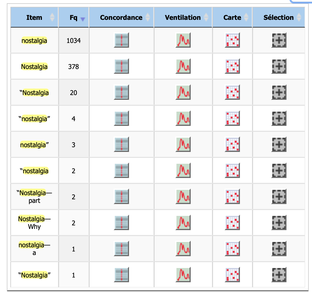 Pour cela nous avons cherché dans un premier temps les occurrences du mot "nostalgia" à l'aide du dictionnaire afin de voir quelle typographie est la plus utilisée et nous constatons qu'une fois encore le mot "nostalgia" écrit en miniscule est celui que l'on retrouve le plus avec 534 occurrences. Nous utiliserons donc cette typographie pour notre recherche.