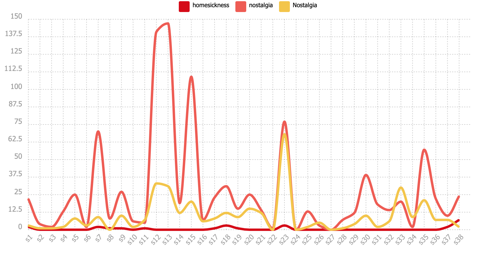 Nous avons également voulu voir à l'aide de la ventilation la répartition des mots "homesickness", "nostalgia" et "Nostalgia". Nous constatons que le mot le plus fréquent est "nostalgia" en minuscules. Dans certaines parties du corpus la typographie du mot "nostalgia" se confond avec "Nostalgia" mais la plupart du temps le mot "nostalgia" en minuscules est bien plus présent. Nous constatons que "homesickness" est présent également dans le corpus mais en petit nombre.
