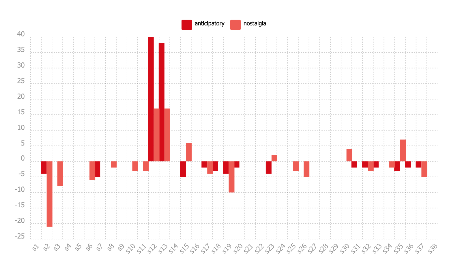 A l'aide de la ventilation nous pouvons voir que le mot "anticipatory" est spécifiquement présent dans les parties 12 et 13, il est plus présent que le mot "nostalgia"". En comparant avec le total du corpus nous pouvons donc nous douter que le mot "anticipatory" n'est pas le mot le plus utilisé vraiment avec le mot nostalgia mais qu'il a sûrement fait l'objet d'un article où le sujet a été abordé et développé dans notre corpus, voilà pourquoi nous le retrouvons à une fréquence plus élevée que les autres mots. Nous pouvons voir que dans certaines parties ces mots sont sous spécifiées (en dessous de 0).