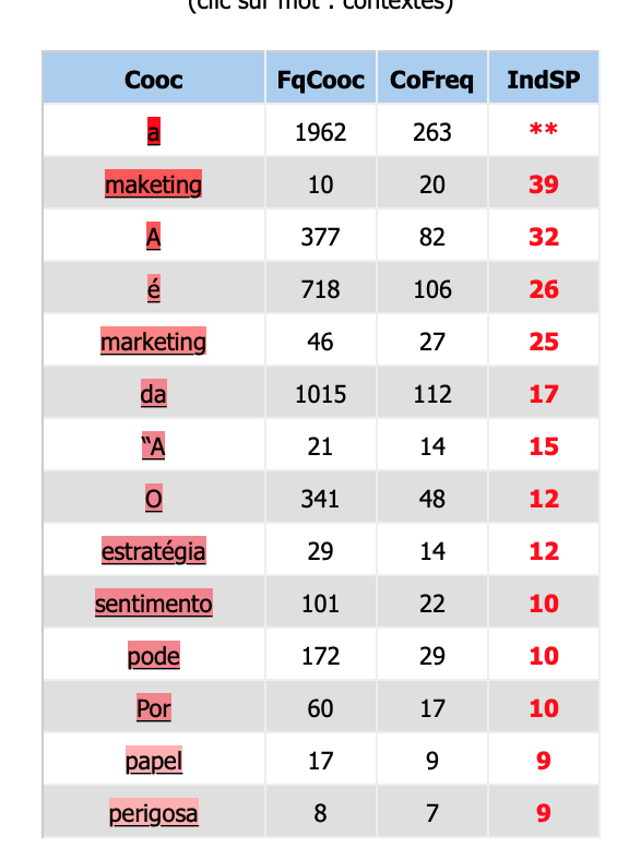 A travers le noeud des cooccurrents on peut voir les mots avec les apparitions les plus fréquentes. En rouge foncé les coocurrences les plus présentes. On peut voir les mots "estratégia" et "perigosa" qui signifie "dangereux". Nous pouvons voir que les stratégies marketing sont donc perçues comme "dangereuses", car cela ferait appel à de la manipulation affective.