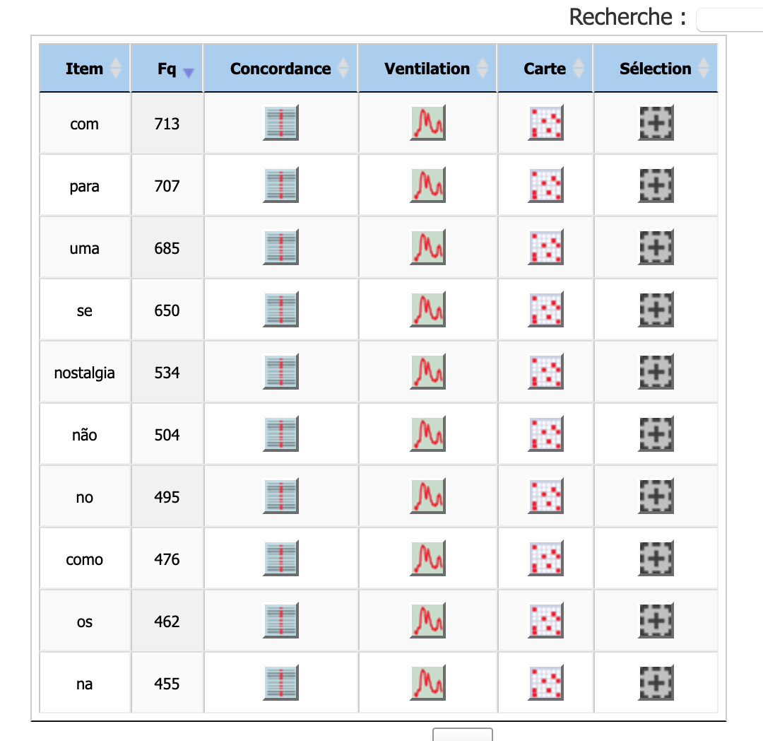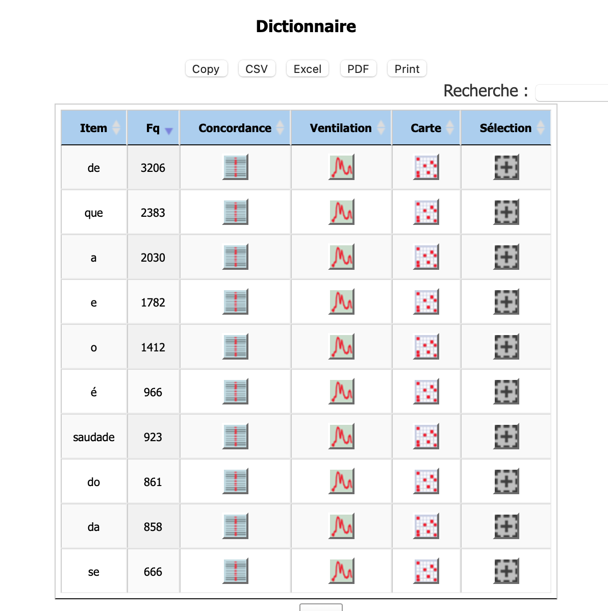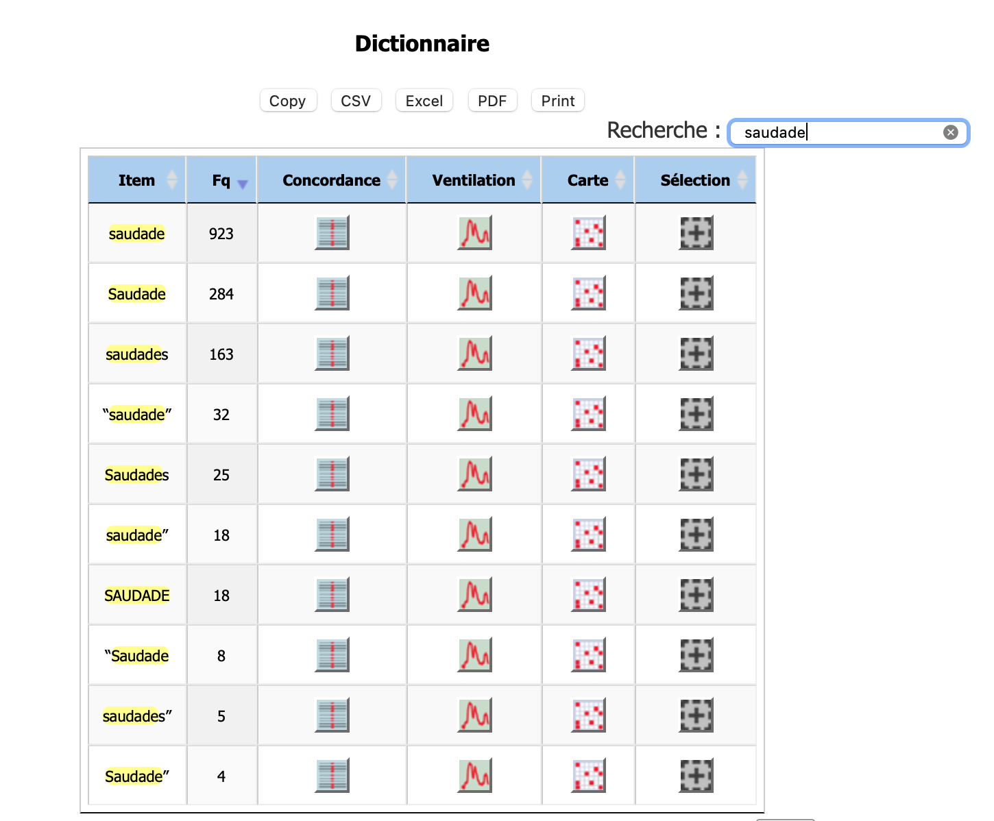 Nous constatons que la typographie du mot "saudade" en minuscule est la plus présente dans le texte (923 occurrences), nous utiliserons donc cette typographie pour faire nos analyses.