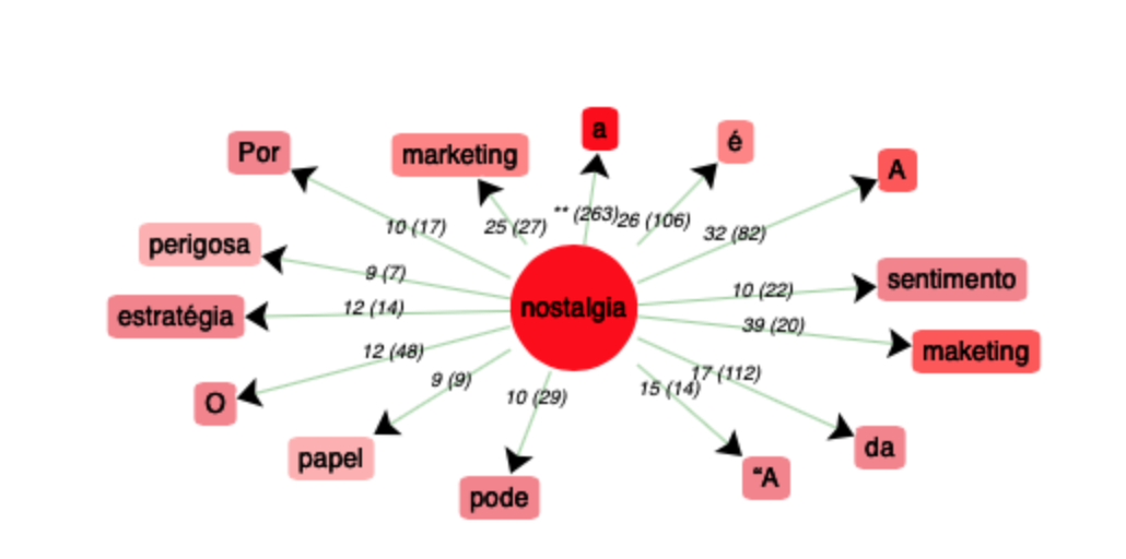 En analysant les cooccurrents on retrouve les mots "marketing"", "estratégia" et "sentimento", ce qui confirme notre hypothèse première que le mot "nostalgia" est utilisé en marketing pour jouer sur le côté affectif et sentimental.