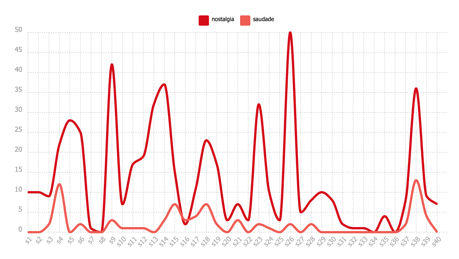 En utilisant la ventilation pour les mots "saudade" et "nostalgia" on constate que le mot saudade est beaucoup moins utilisé. Les courbes ne sont pas identiques et donc l'emploi du mot nostalgia est beaucoup plus utilisé. On peut donc en conclure que les deux mots ne sont pas vraiment synonymes et qu'ils sont employés dans des contextes différents et précis.