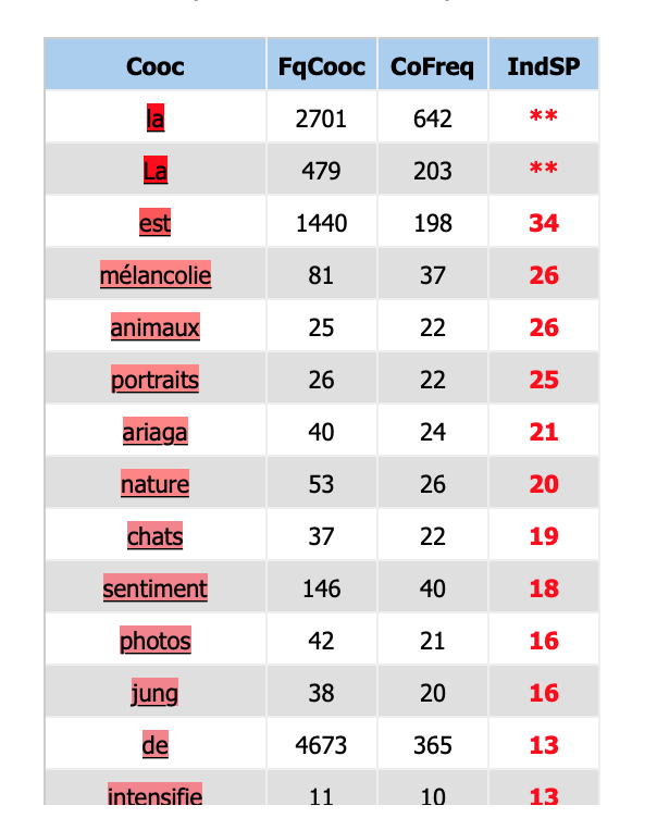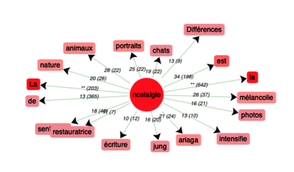 En observant les cooccurrents du mot "nostalgie" on retrouve en première position la plus fréquente le mot "mélancolie", qui est défini comme : " Un état de tristesse vague accompagné de rêverie". Nous pouvons donc voir qu'en français le mot "nostalgie" a une connotation plutôt négative. On retrouve également le champ sémantique des animaux et des sentiments mais également le domaine de la photographie.