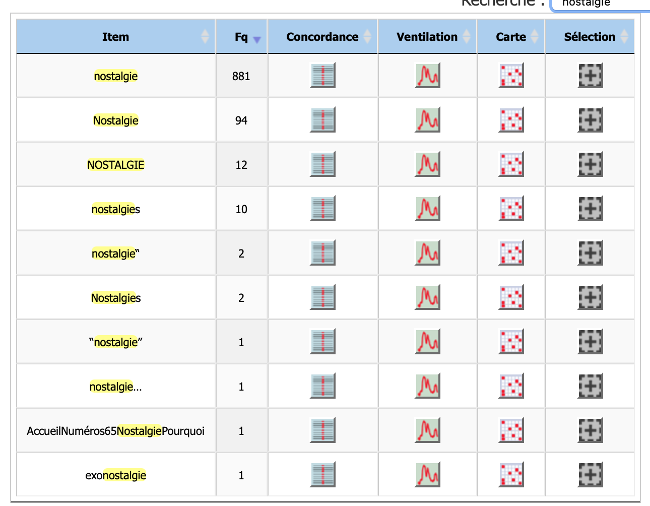 Nous avons également choisi d'analyser le mot "nostalgie" en français. A l'aide du dictionnaire on peut voir que l'on retrouve 881 occurrences du mot "nostalgie".