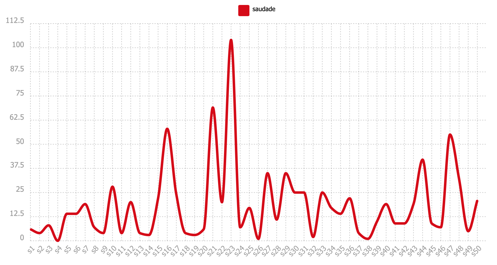 Avec l'outil ventilation nous avons analysé la répartition du mot "saudade" au sein de notre corpus. Nous constatons que la fréquence d'apparition est la plus haute dans les parties 22 et 23.