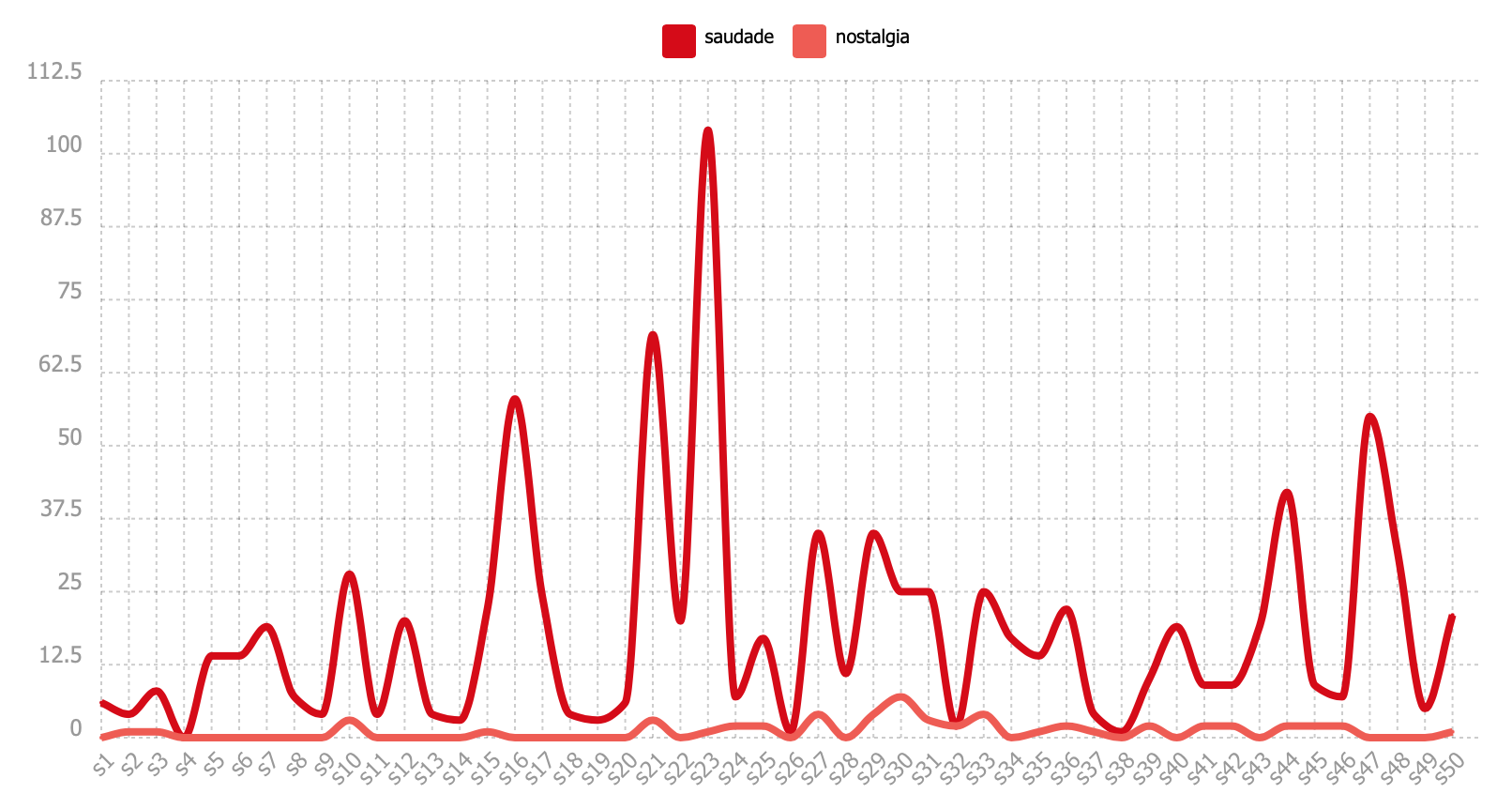 En comparant l'analyse précédente avec le mot "nostalgia" en portugais, nous constatons que le mot "nostalgia" est beaucoup moins fréquent que le mot "saudade" en portugais, par conséquent nous pouvons déduire que ces deux mots ne sont pas vraiment utilisés comme des synonymes.