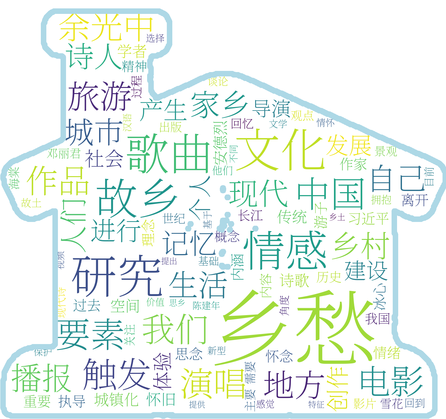 et 愁 chóu "mélancolie". Ainsi, dans le nuage de mots, nous pouvons remarquer les termes tels que 故乡 gùxiāng "ville natale",