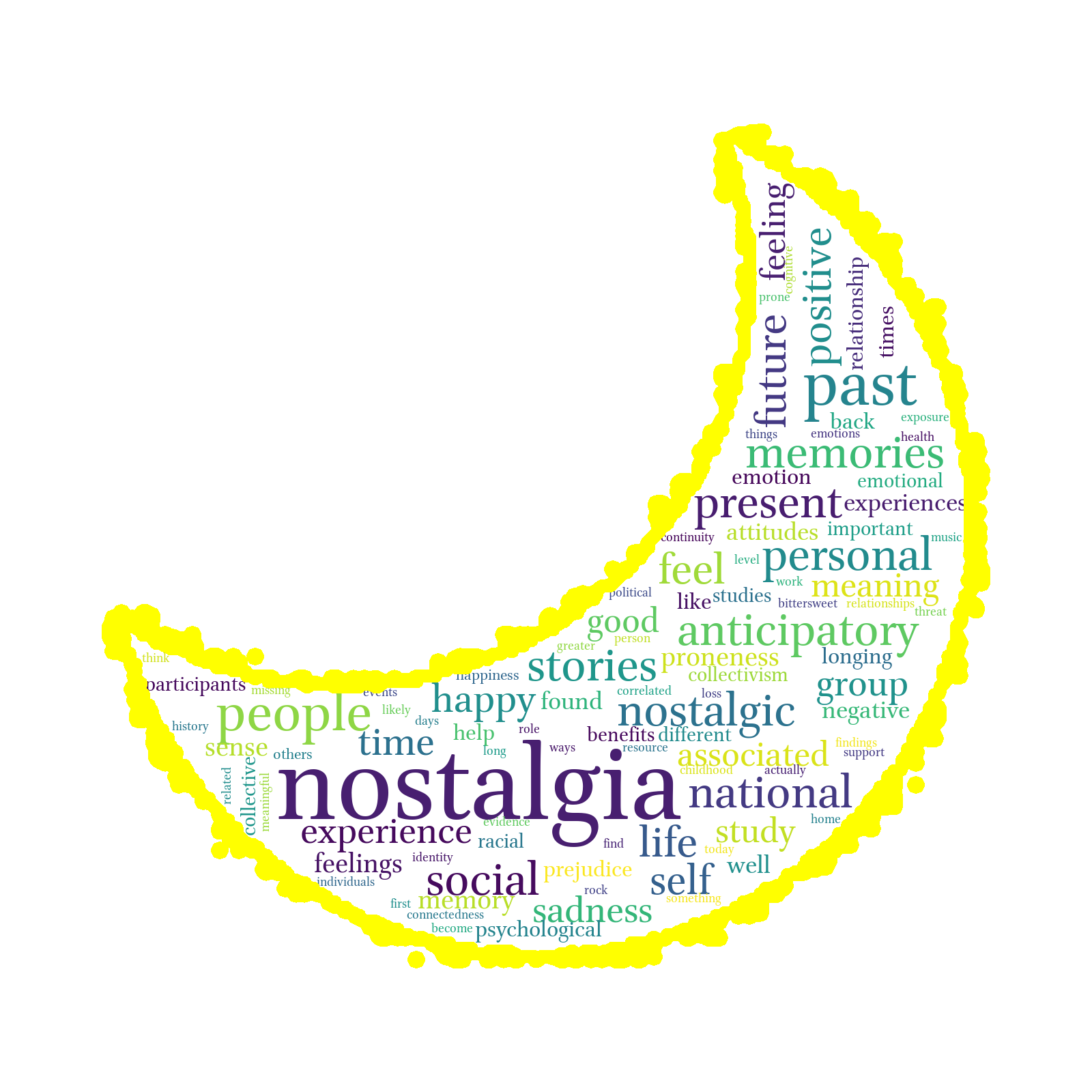 Dans un premier temps, le nuage autour du mot "nostalgia" en anglais nous révèle qu'il s'agit d'une notion étroitement liée au temps,