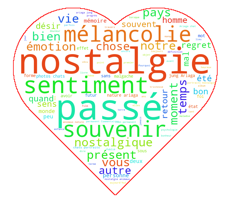 Le terme marketing est également intéressant car beaucoup de textes mentionnent l'usage en marketing du sentiment de nostalgie pour promouvoir des produits et booster les ventes. Enfin, on peut également voir le lien entre nostalgia et saudade qui sont donc synonymes et que comme nous le verrons avec le nuage de mot "saudade", n'ont pas exactement les mêmes connotations.